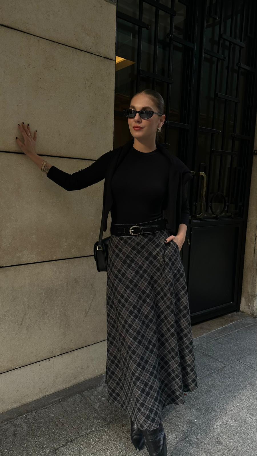 Siyah-Antrasit Önden Yırtmaç Detaylı Kemerli Ekoseli Etek (109-00474)
