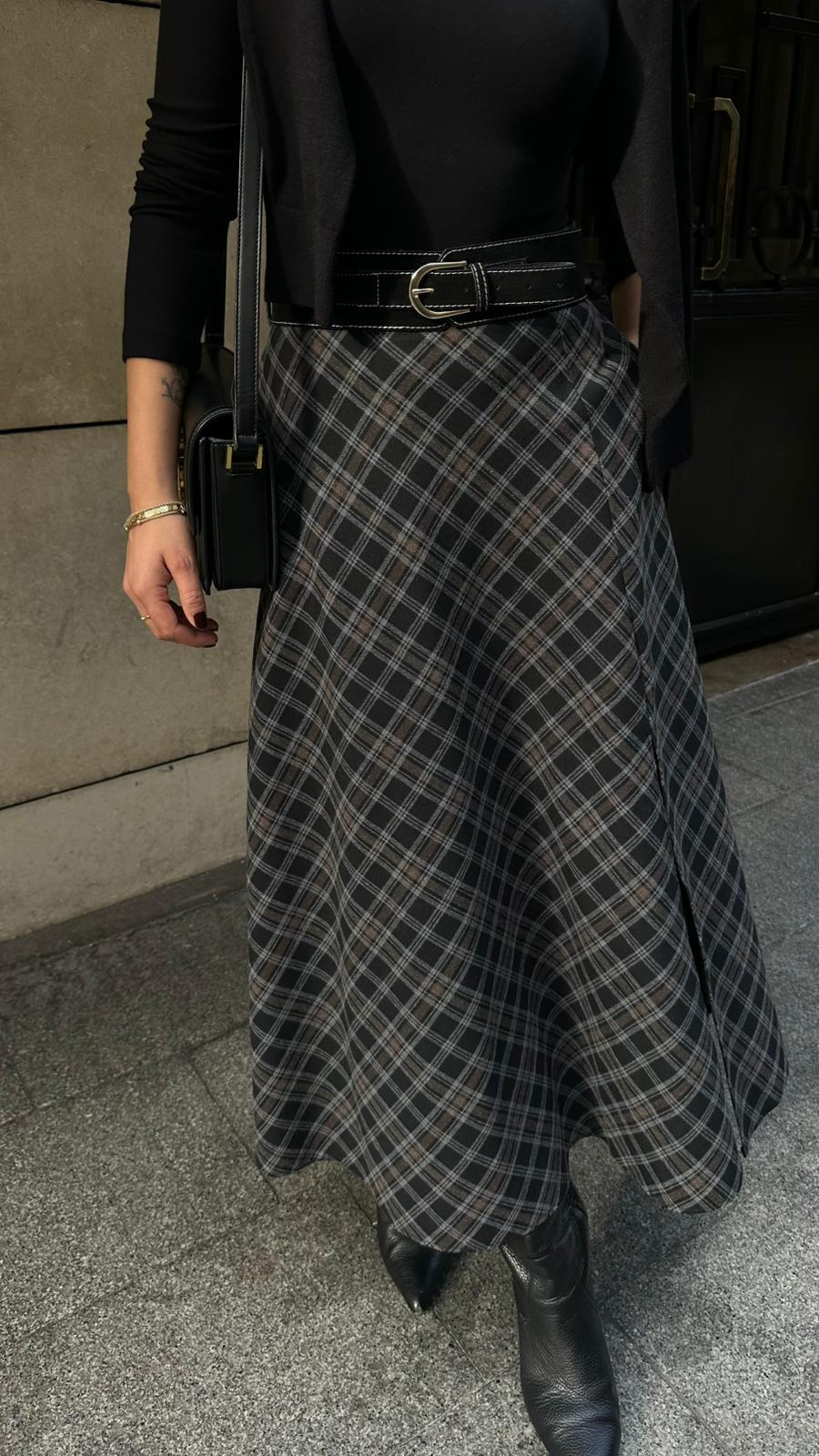 Kahve Önden Yırtmaç Detaylı Kemerli Ekoseli Etek Siyah-Antrasit Önden Yırtmaç Detaylı Kemerli Ekoseli Etek