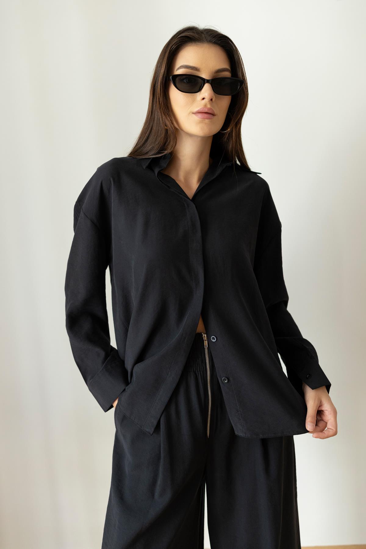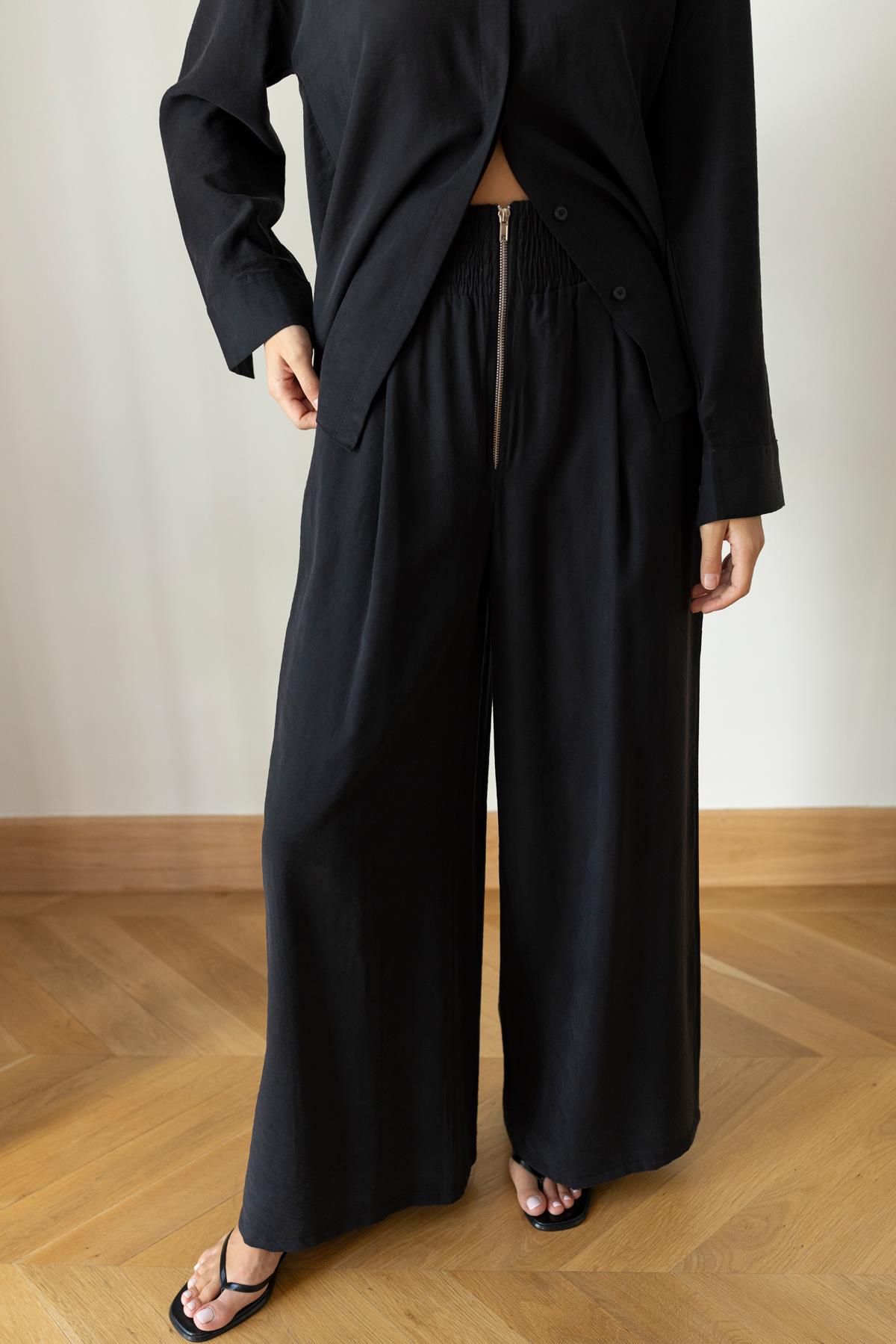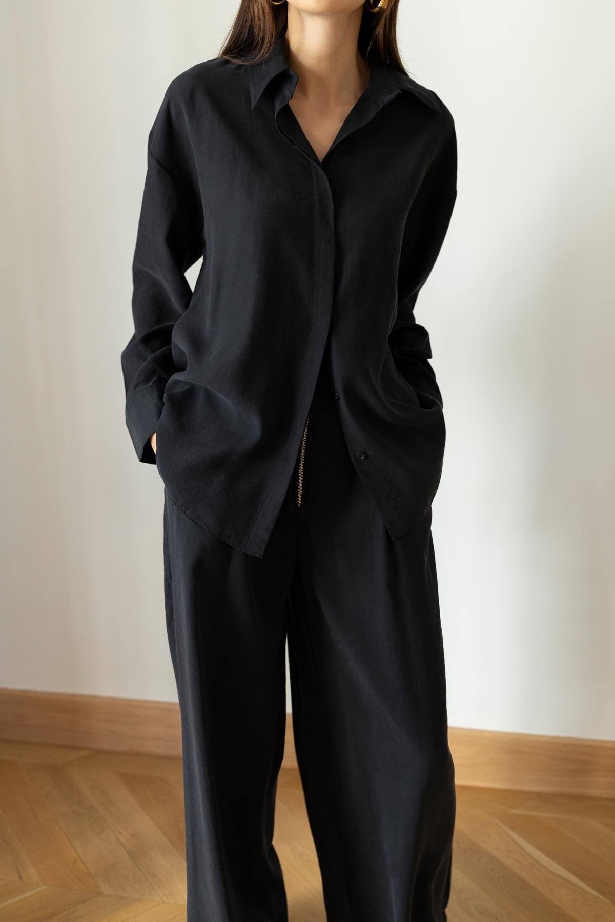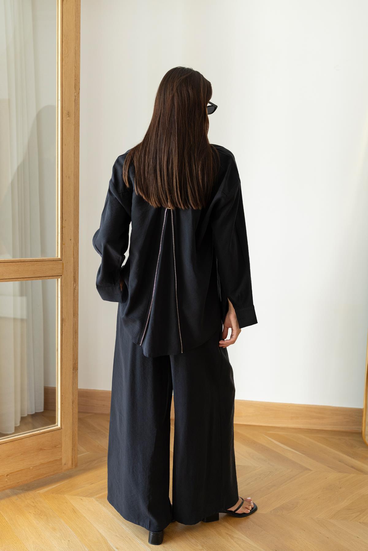 Siyah Arkası Fermuarlı Oversize Gömlek Ve beli Kalın Lastikli Önden Fermuarlı Bol Paça Pantolon Takım (122-00830)
