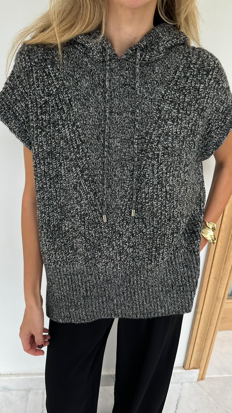 Siyah- Beyaz Kapüşonlu Triko Yelek