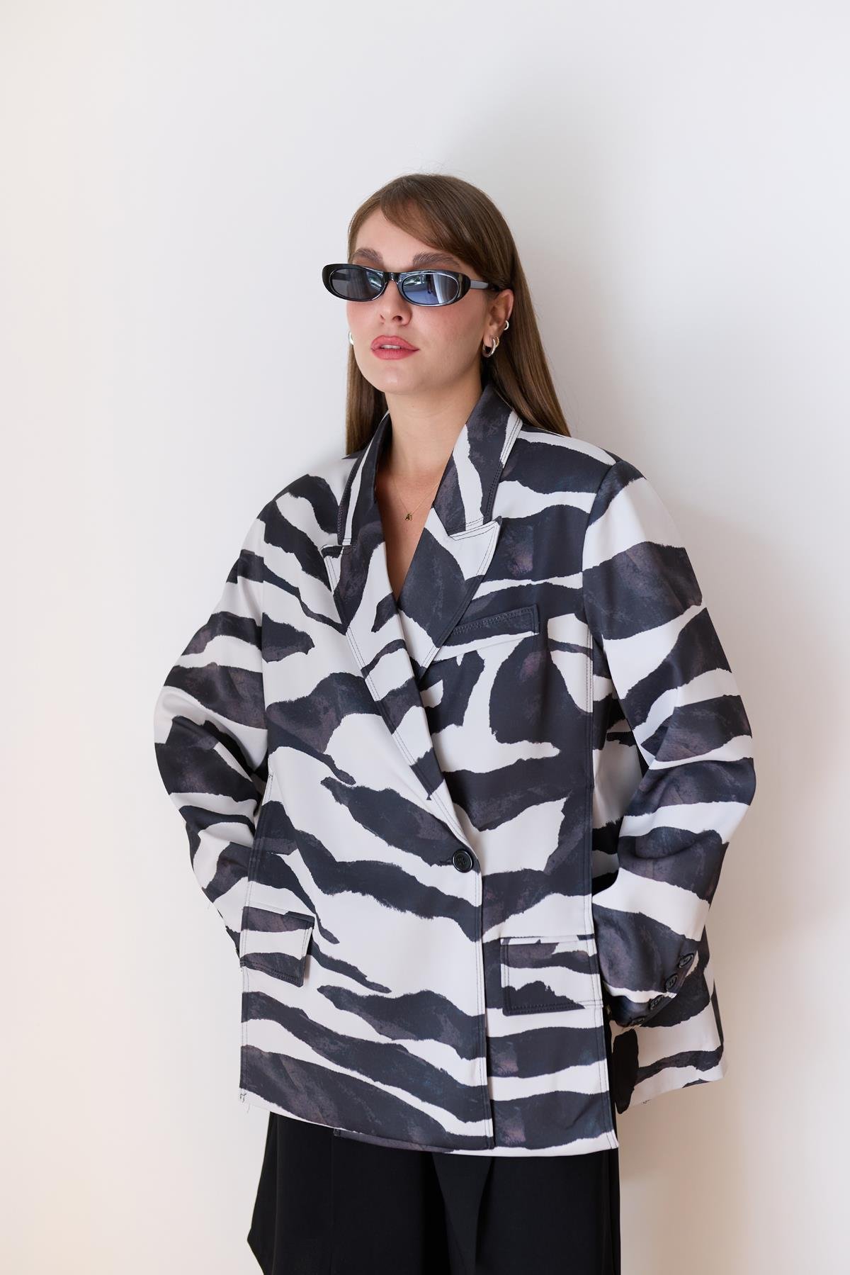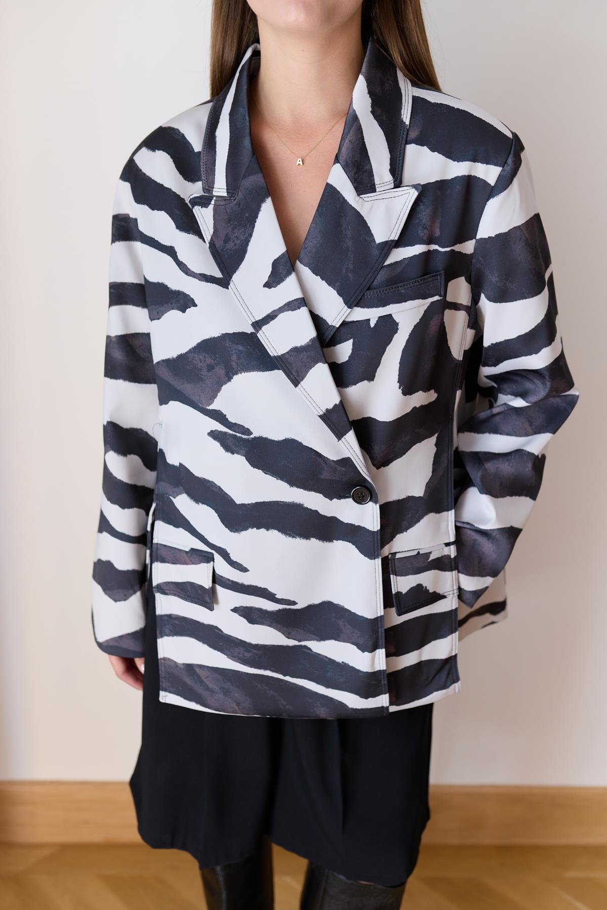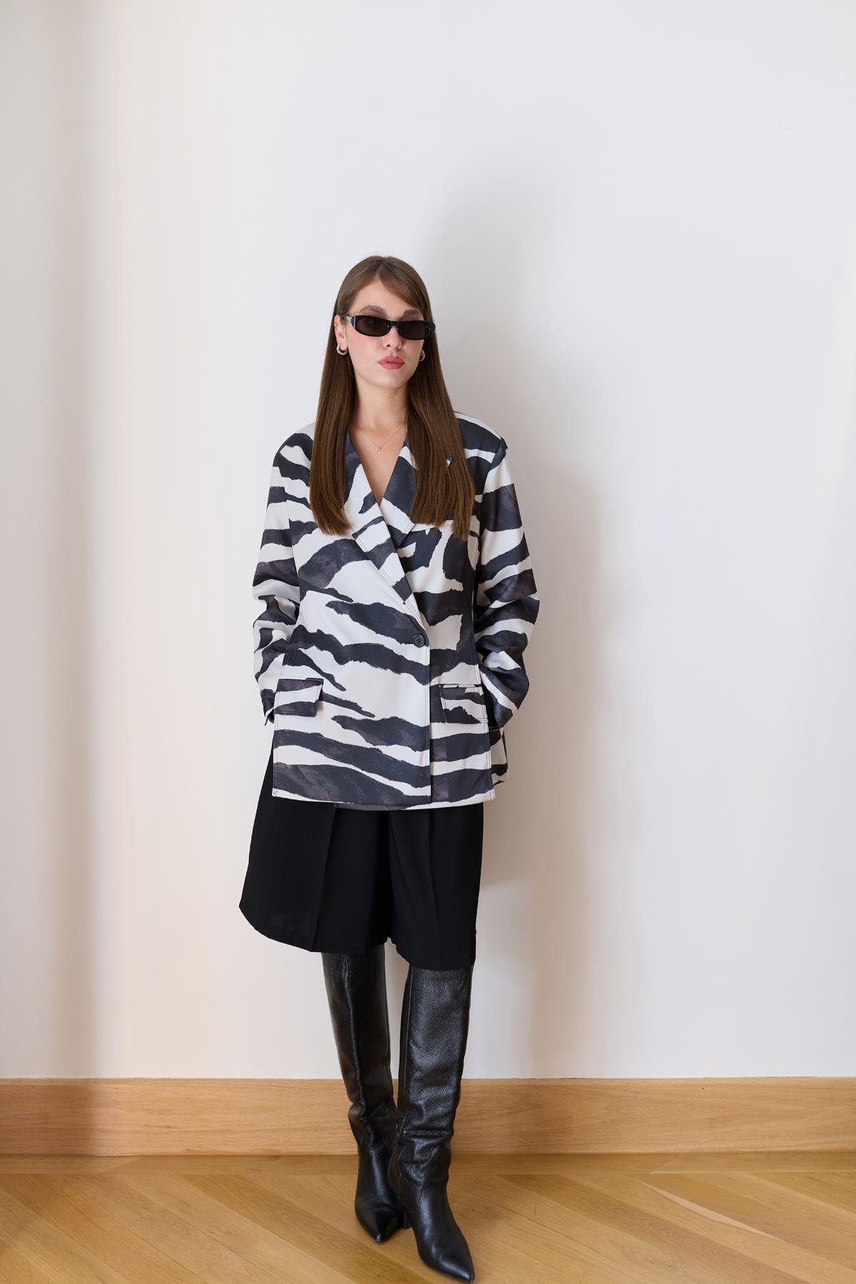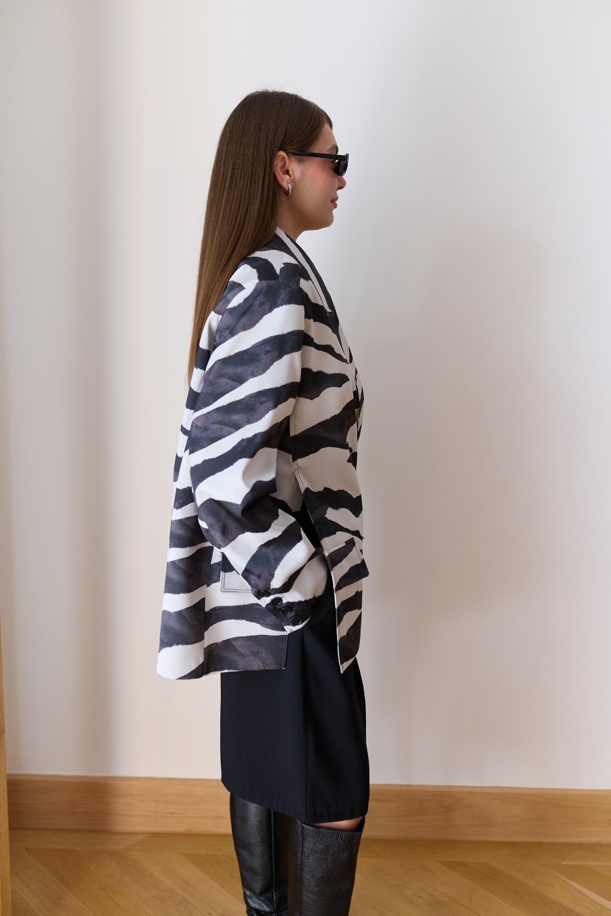 Siyah- Beyaz Zebra Desen Yandan Yırtmaç Detaylı Astarlı Saten Ceket