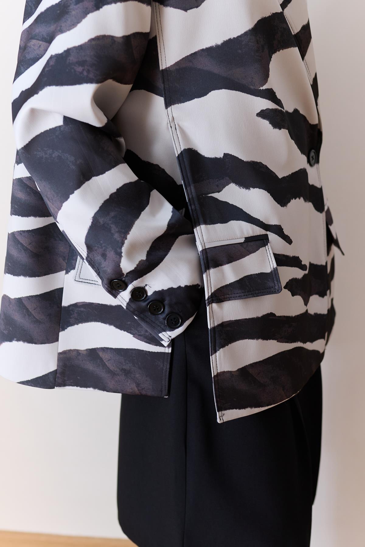 Siyah- Beyaz Zebra Desen Yandan Yırtmaç Detaylı Astarlı Saten Ceket (115-00619)