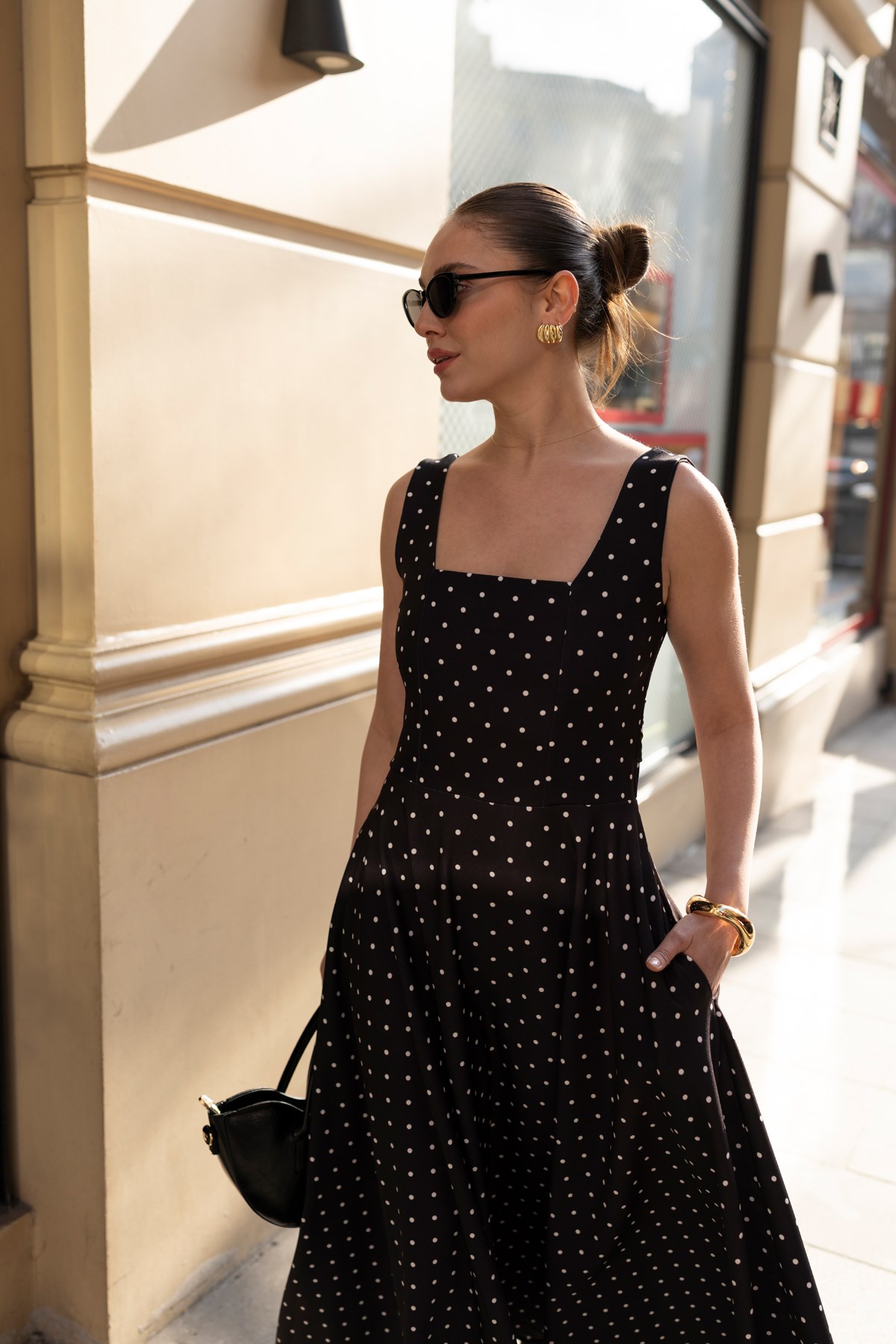 Siyah Kalın Askılı Arkadan Bağlamalı Puantiyeli Elbise (101-01863)