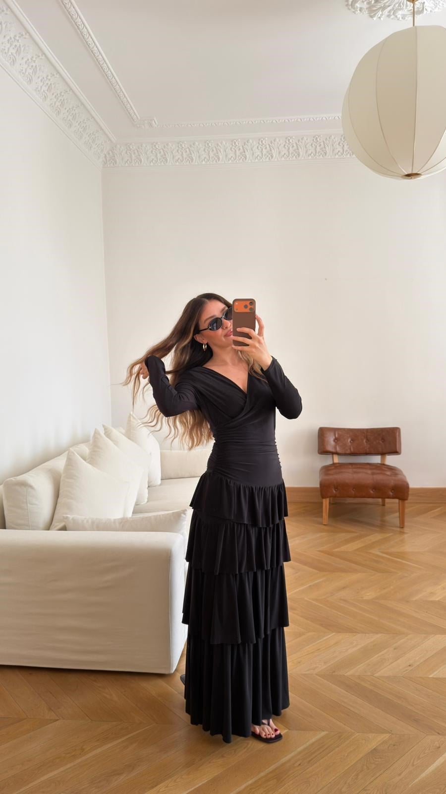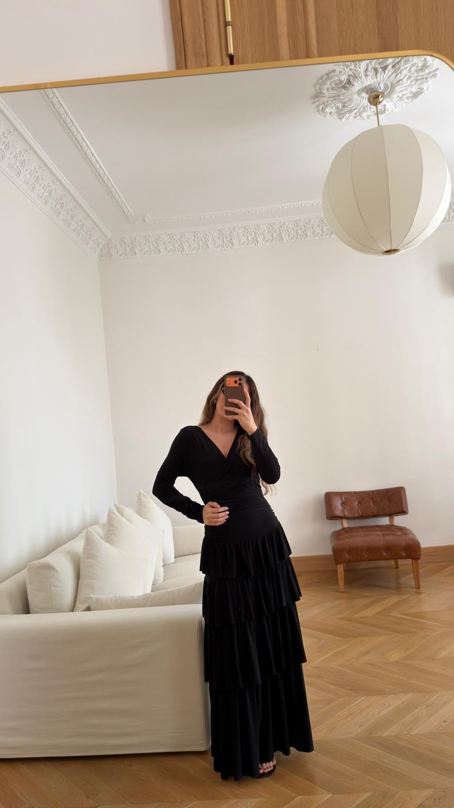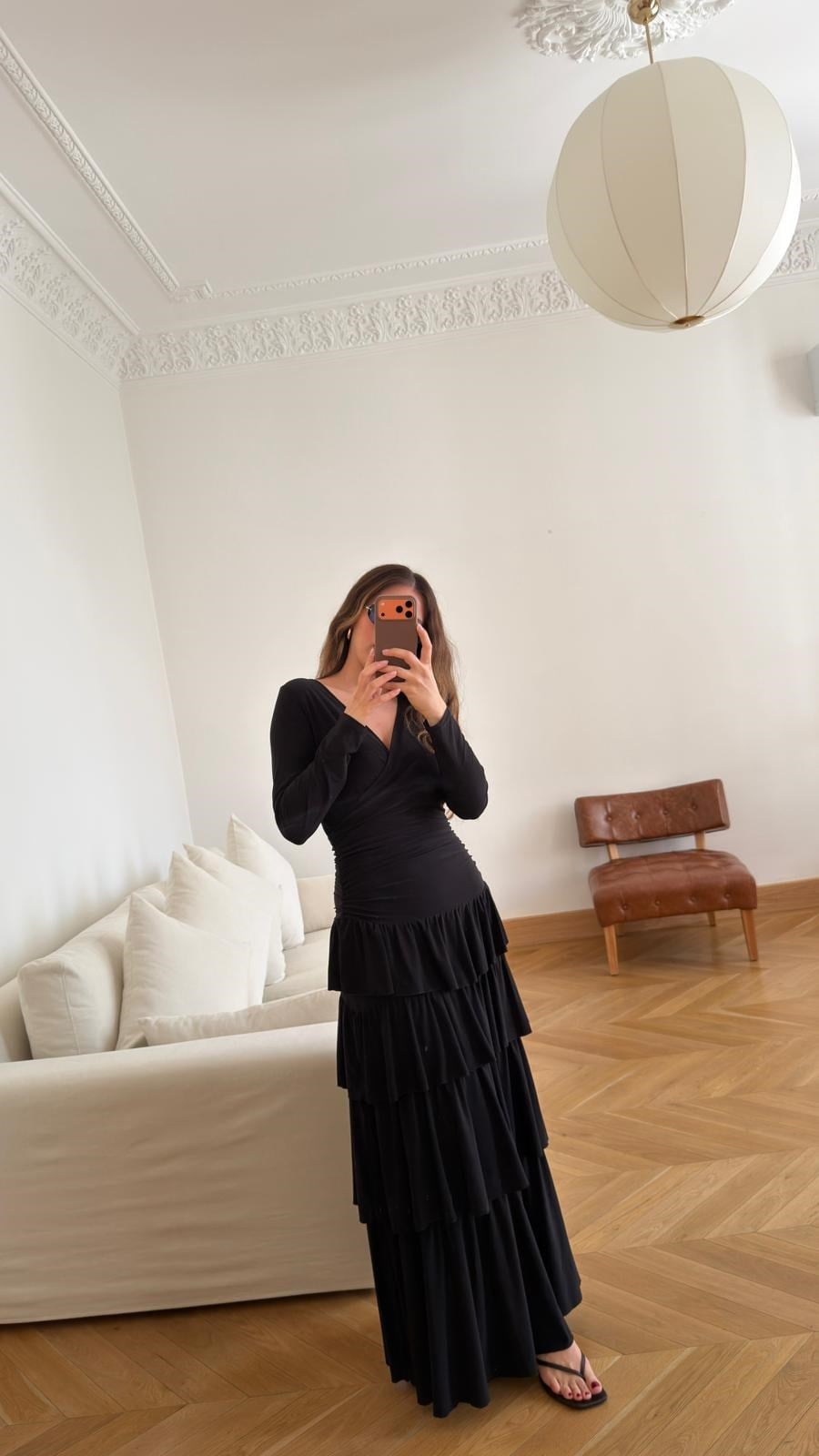 Siyah Kruvaze Yaka  Beli Gipeli Kat Kat Elbise