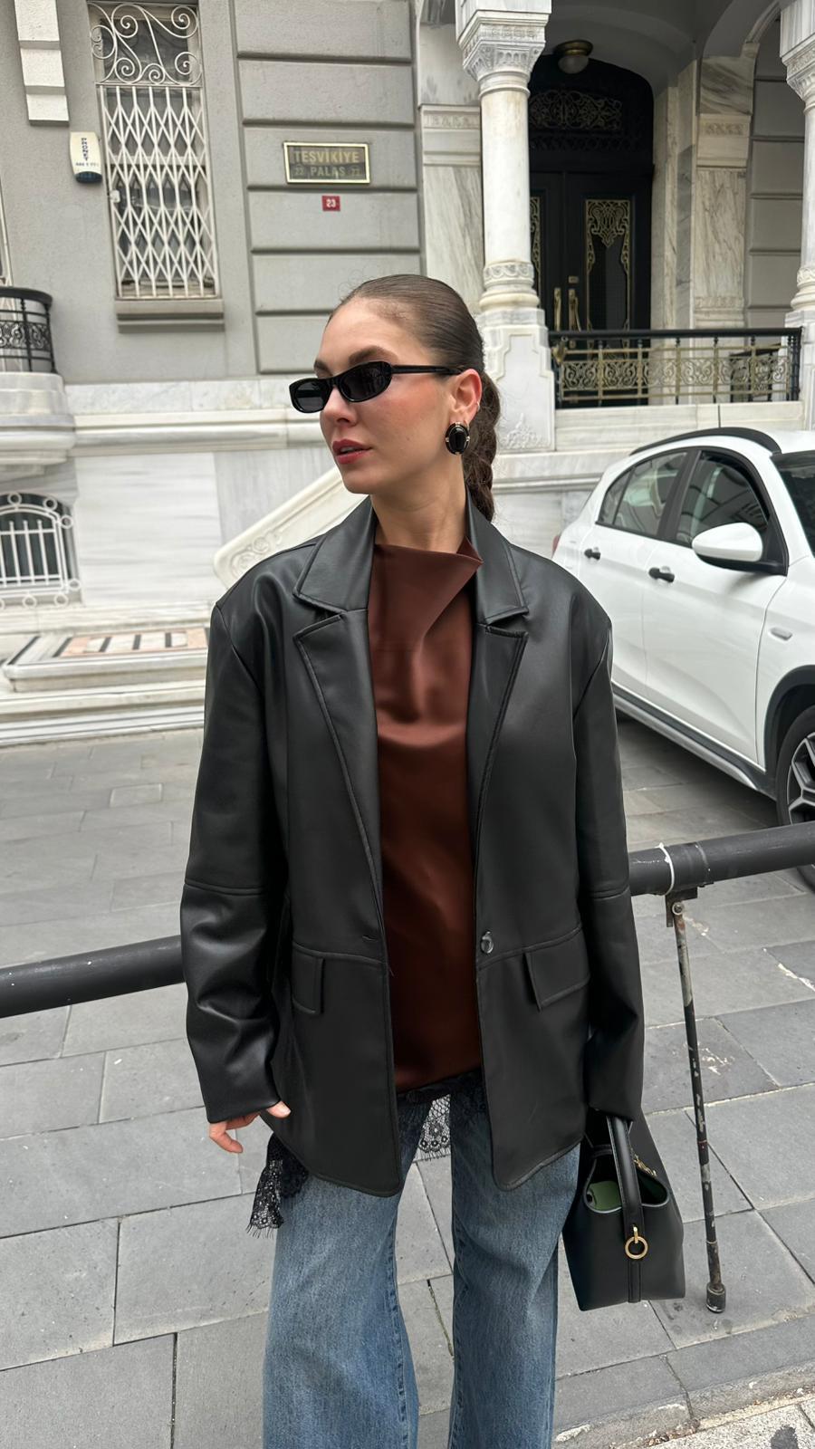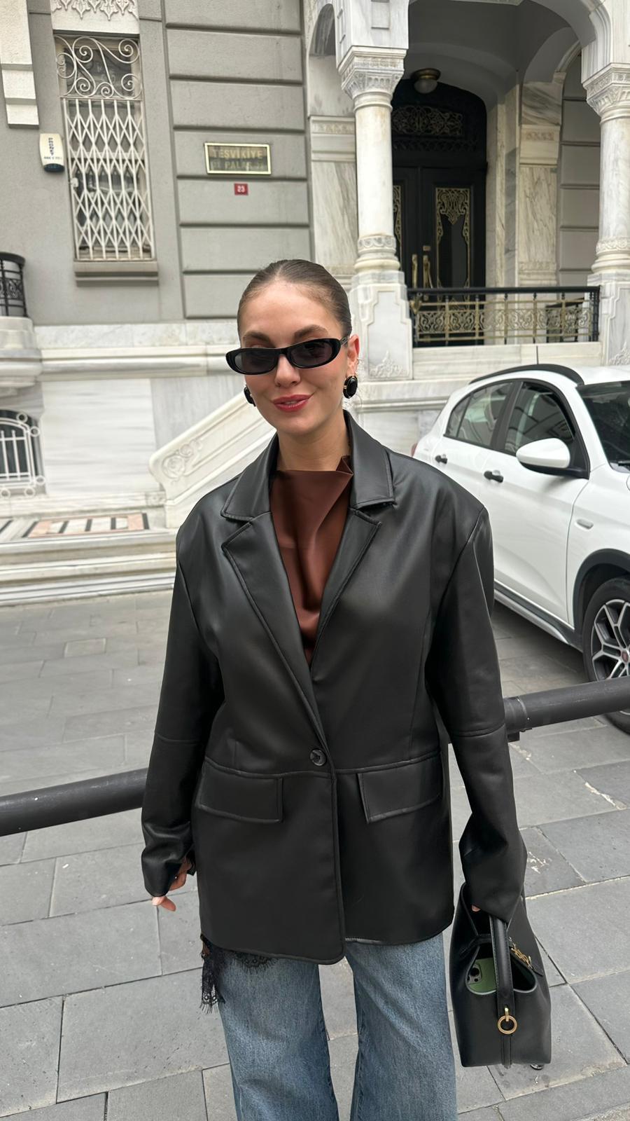 Siyah Önden Cep Detaylı Blazer Deri Ceket (115-00634)