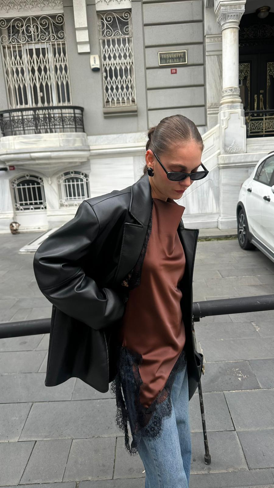 Taba Önden Cep Detaylı Blazer Deri Ceket Siyah Önden Cep Detaylı Blazer Deri Ceket