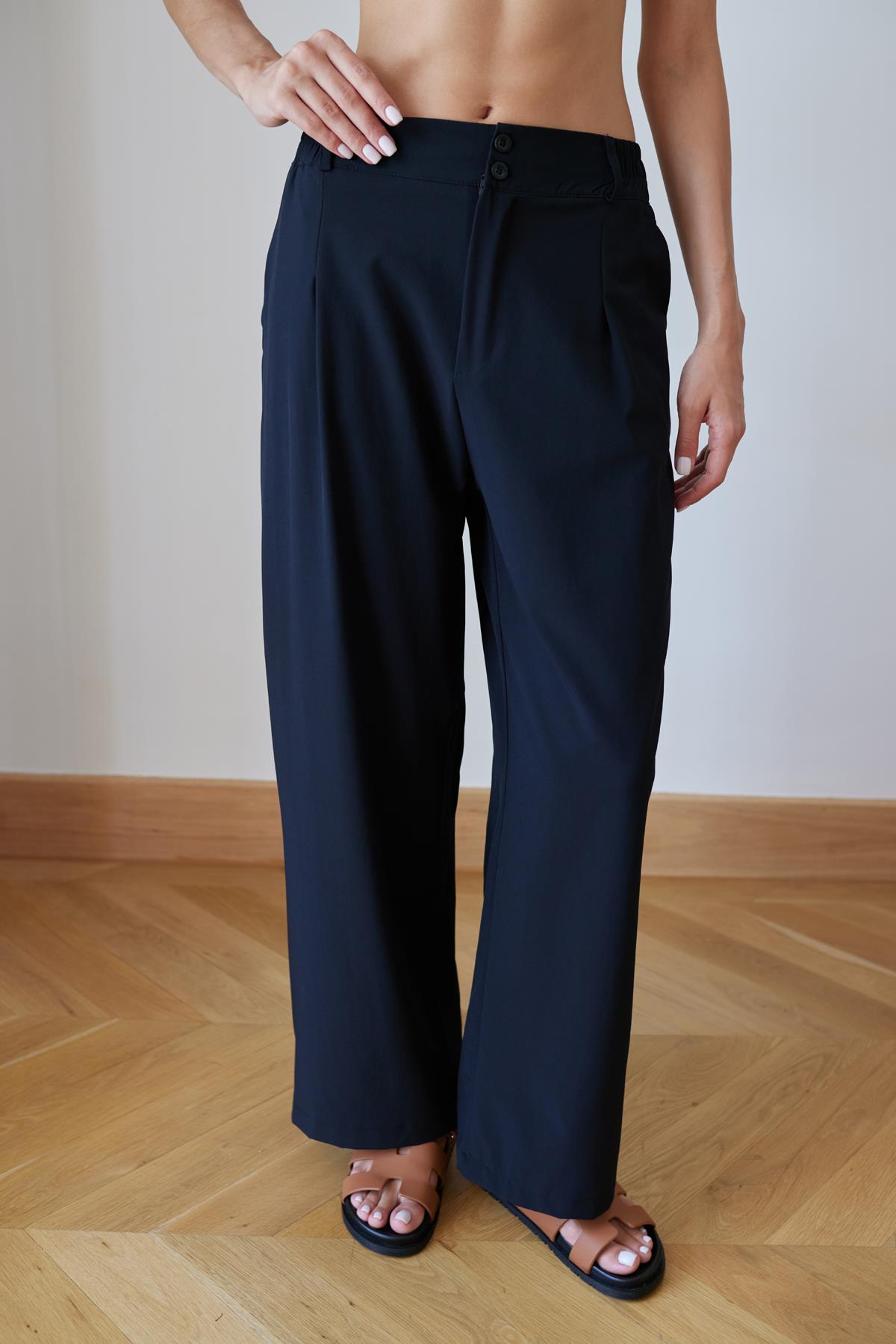 Lacivert Önden İki Düğmeli Belden Lastikli Yazı Detaylı Bol Kesim Pantolon Siyah Önden İki Düğmeli Belden Lastikli Yazı Detaylı Bol Kesim Pantolon
