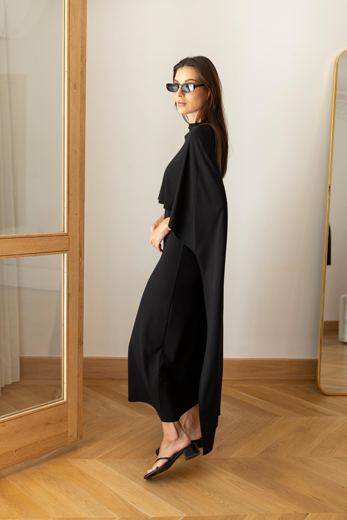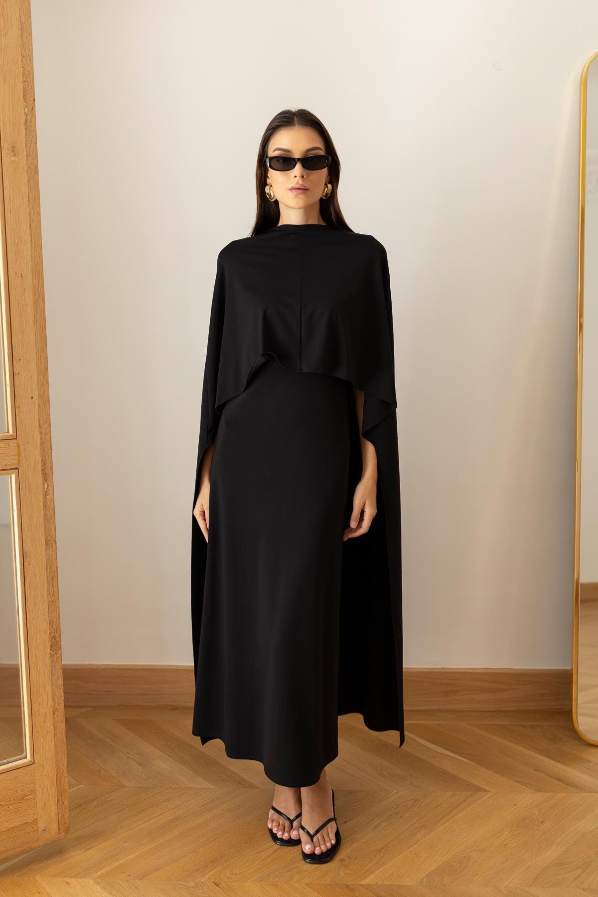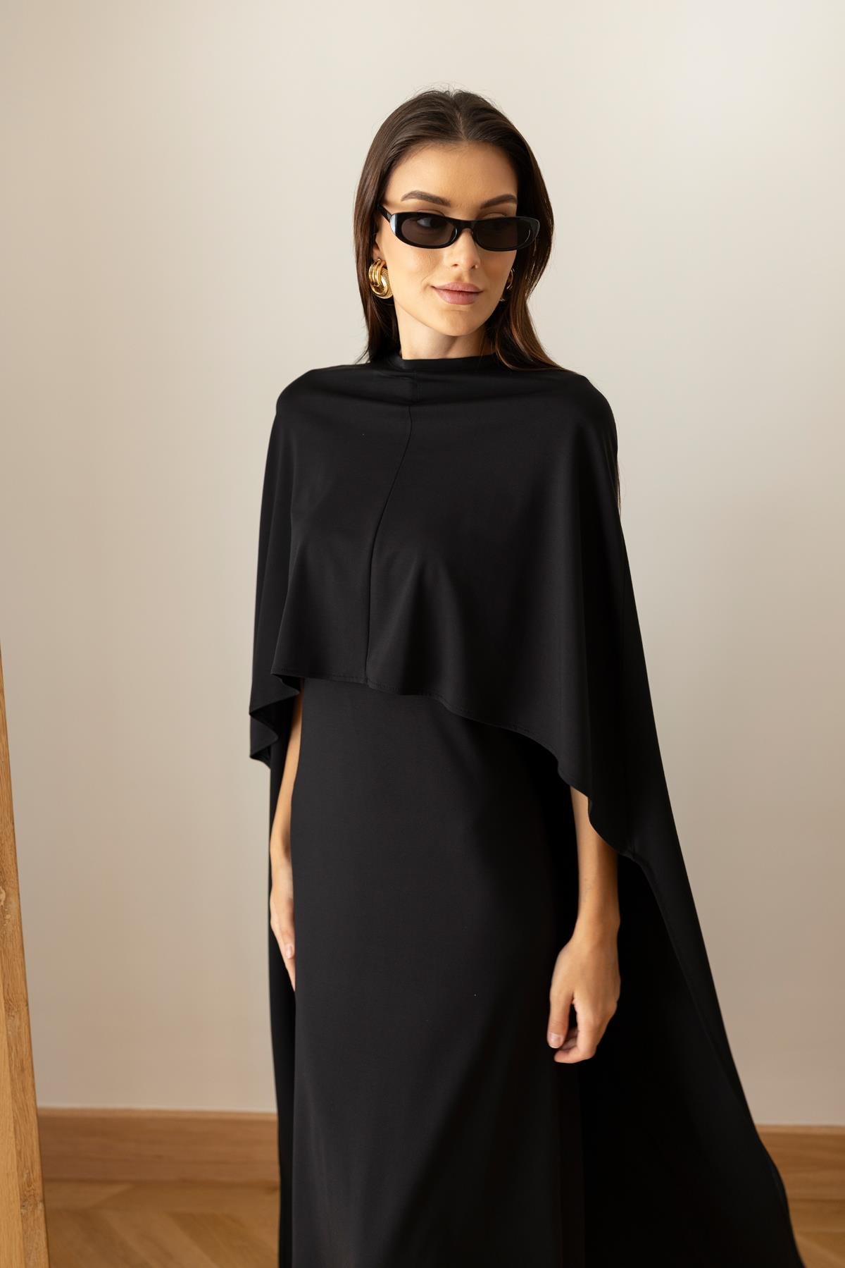 Siyah Pelerin Detaylı Bisiklet Yaka Kısa Koll Elbise (101-01803)