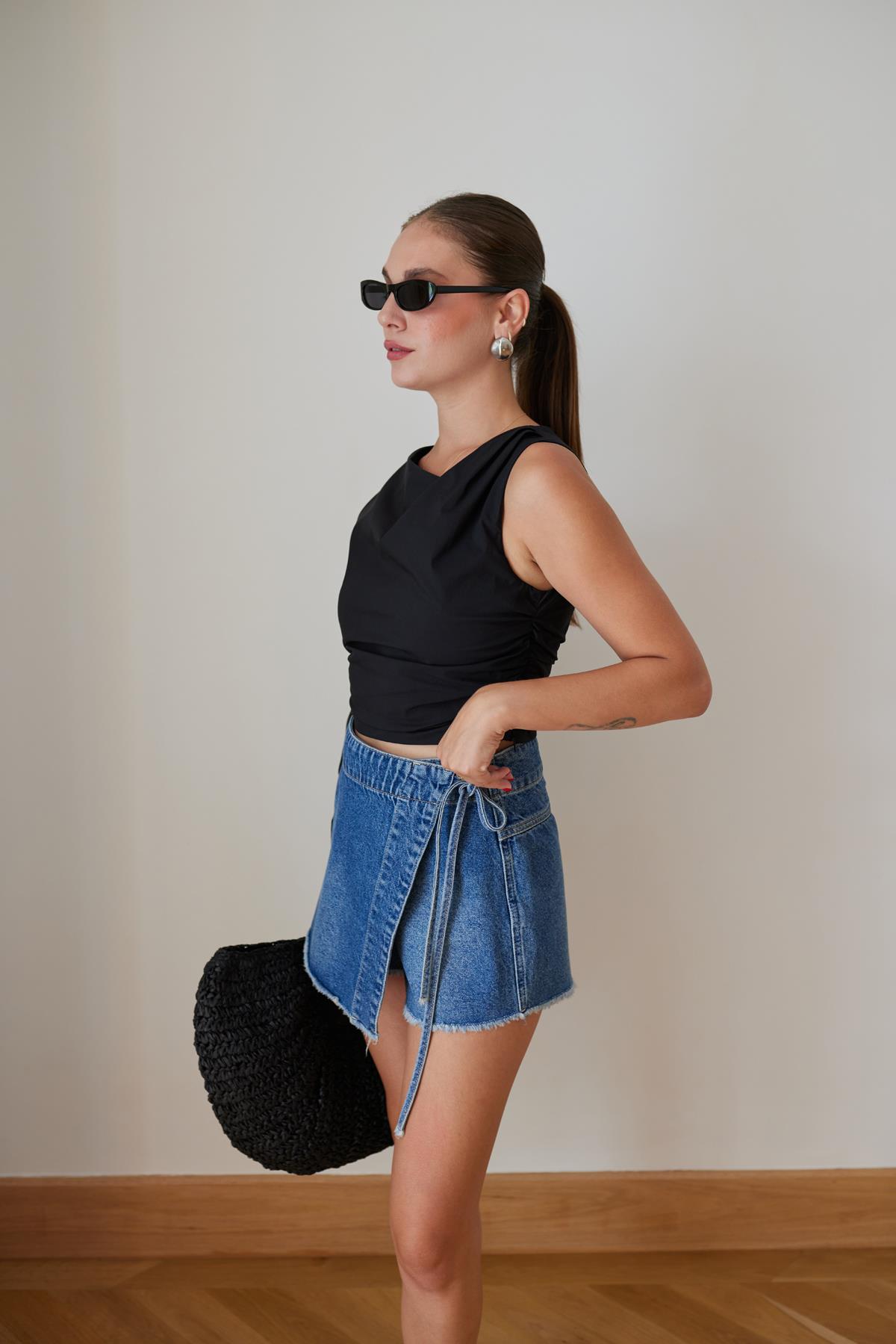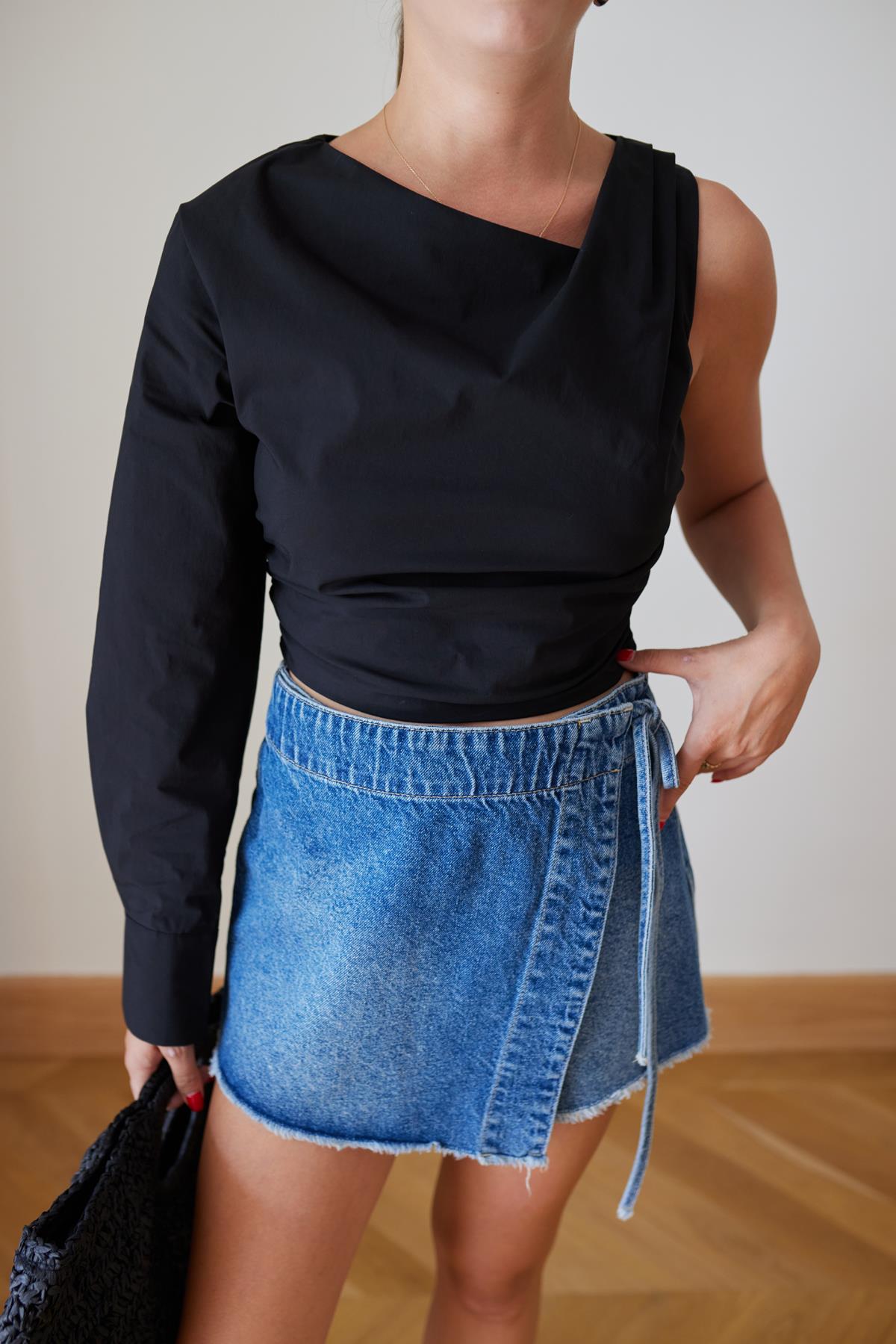 Siyah Sırtı Büzgülü Tek Kol Yandan Fermuarlı Bluz