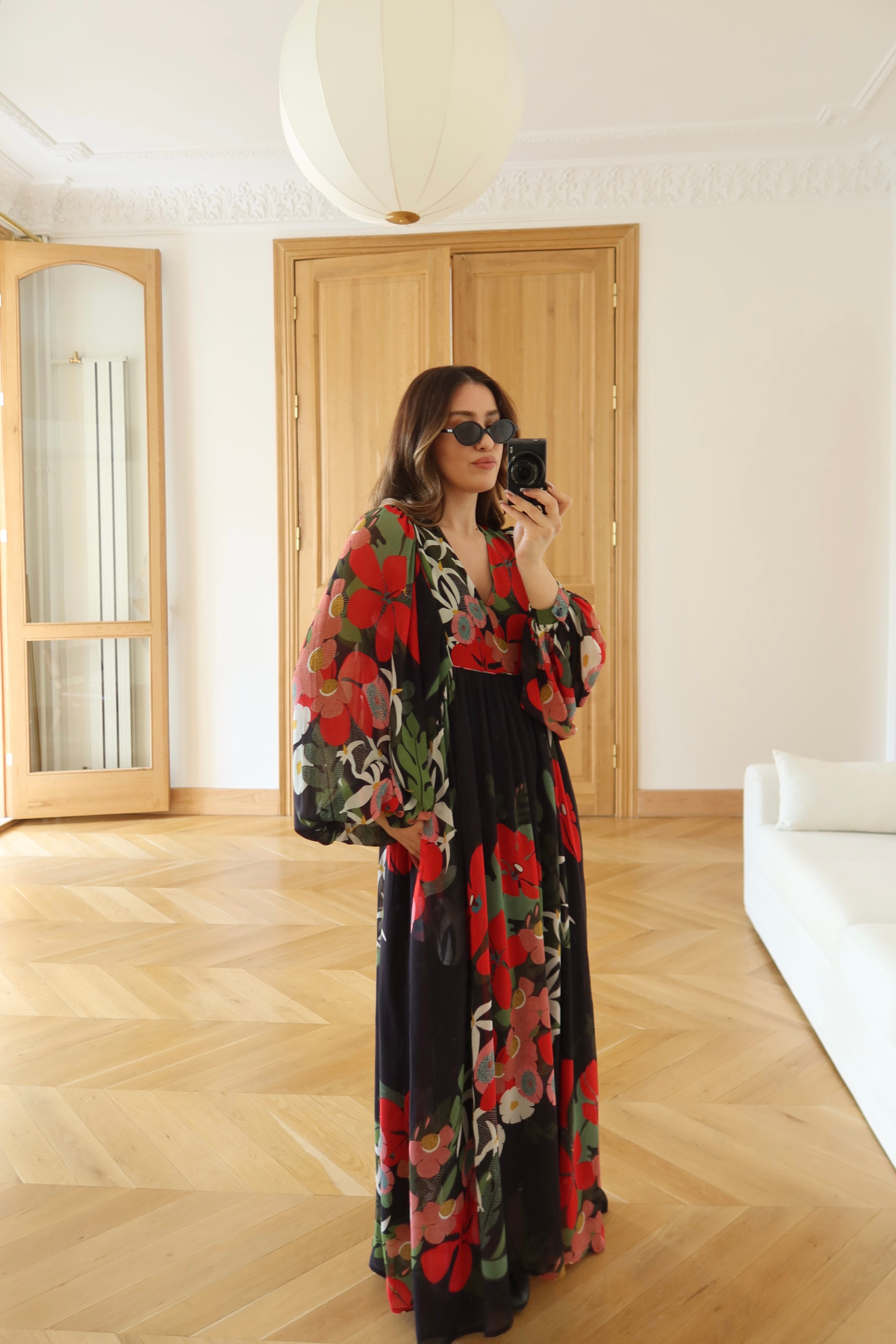 Siyah V Yaka Balon Kol Çiçekli Tasarım  Elbise