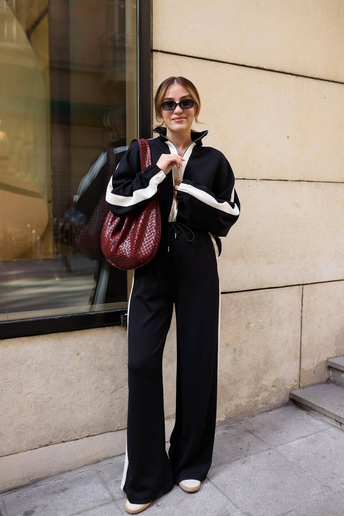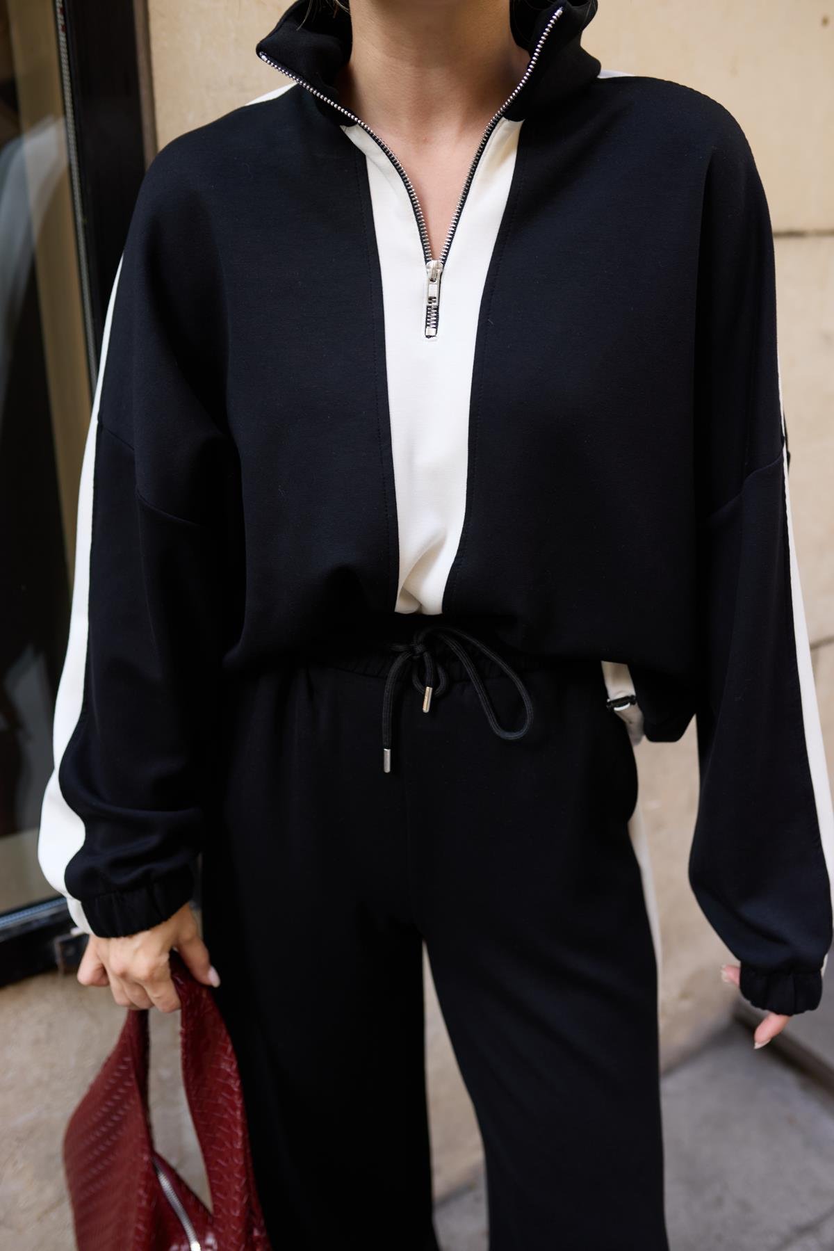 Siyah Yarım Fermuarlı Şerit Detaylı Sweat Pantolon Takım