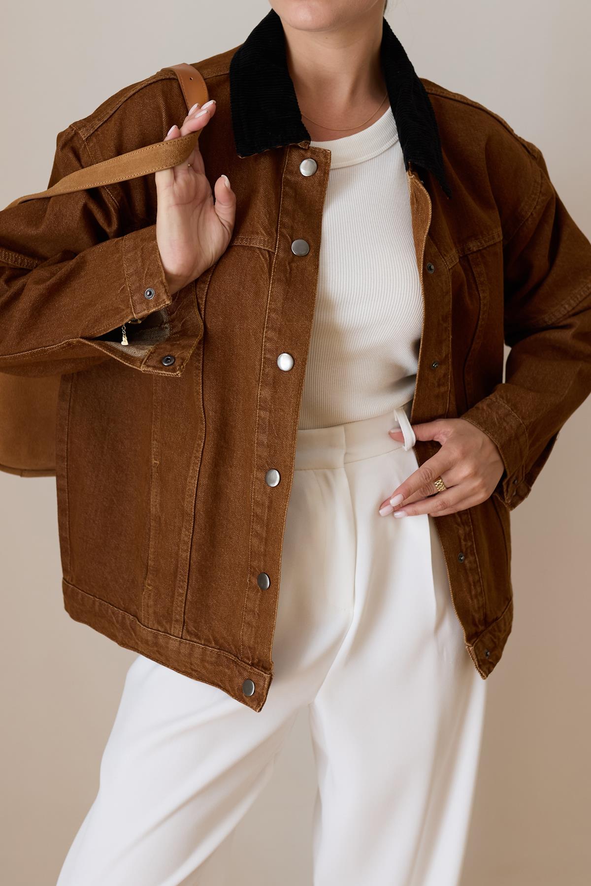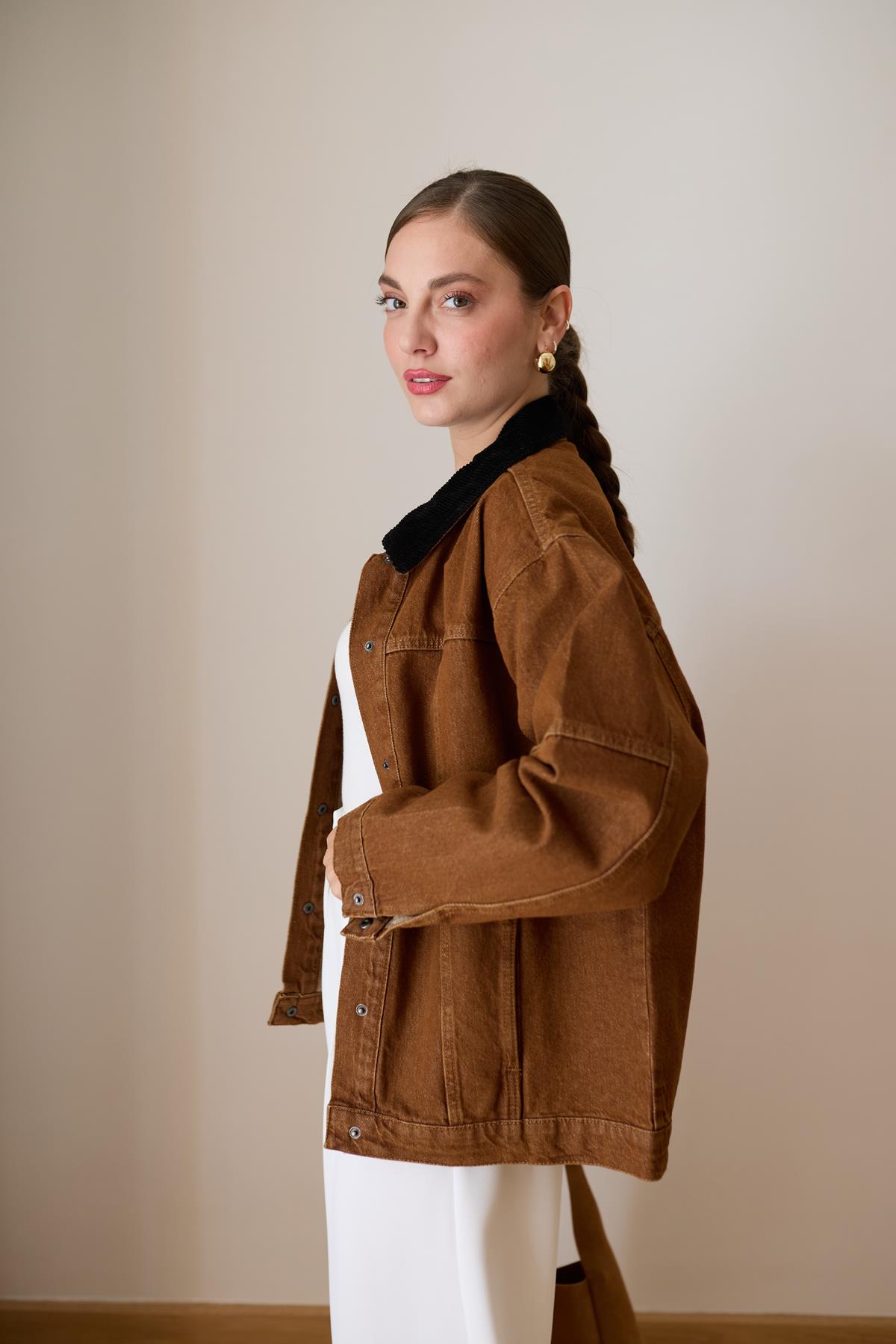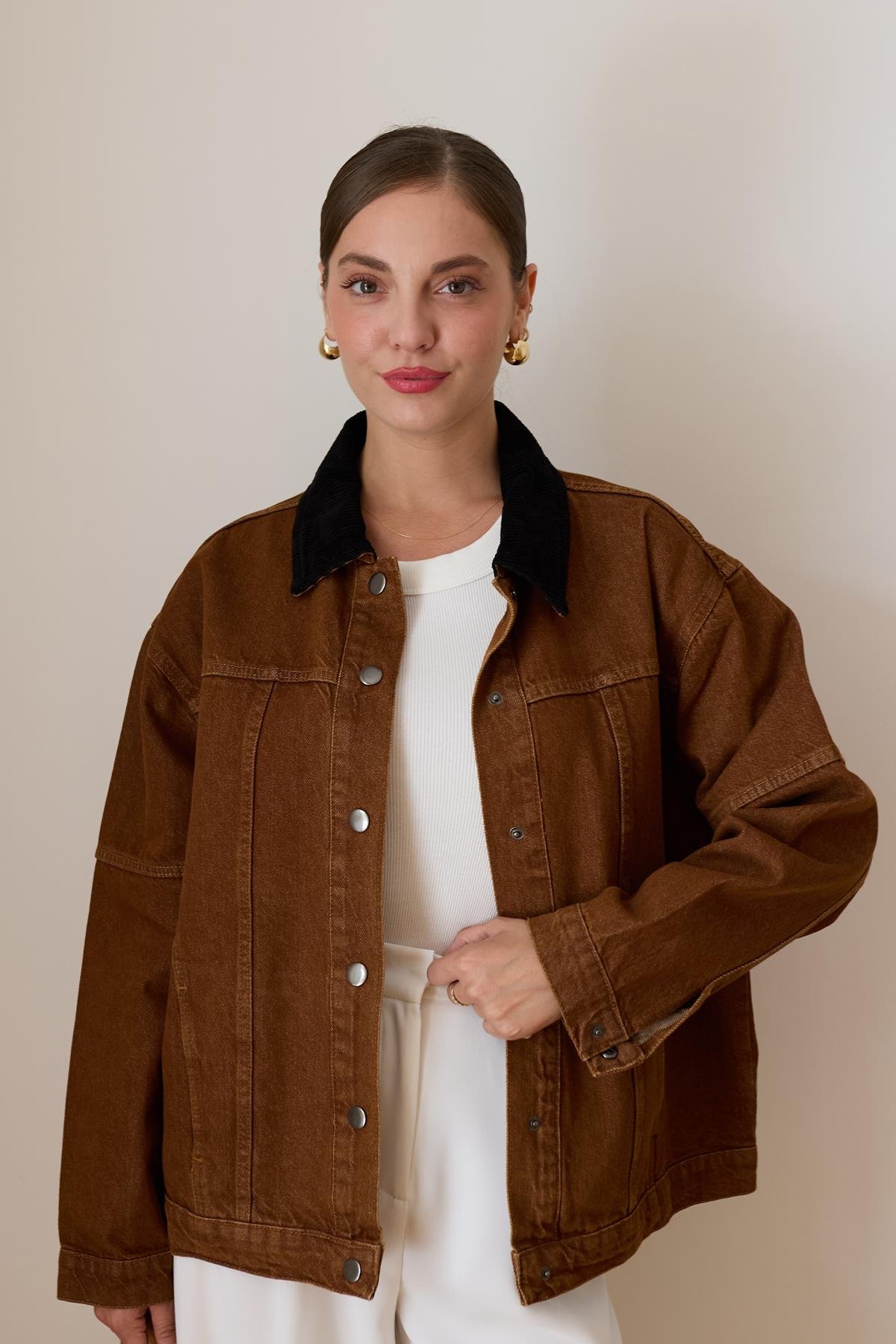 Taba Yakası Kadife Detaylı Çıtçıt Düğmeli Önden Cepli Denim Ceket (115-00605)