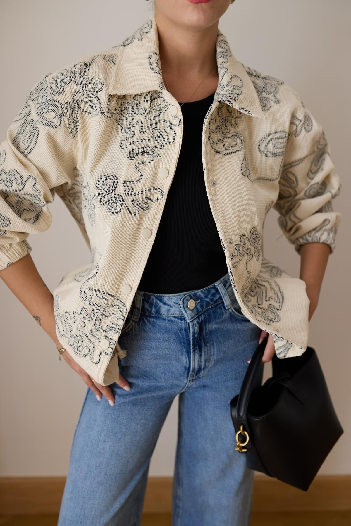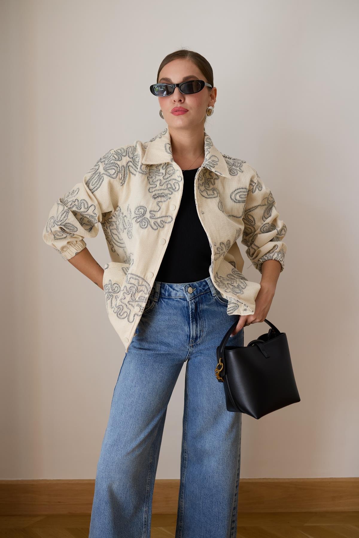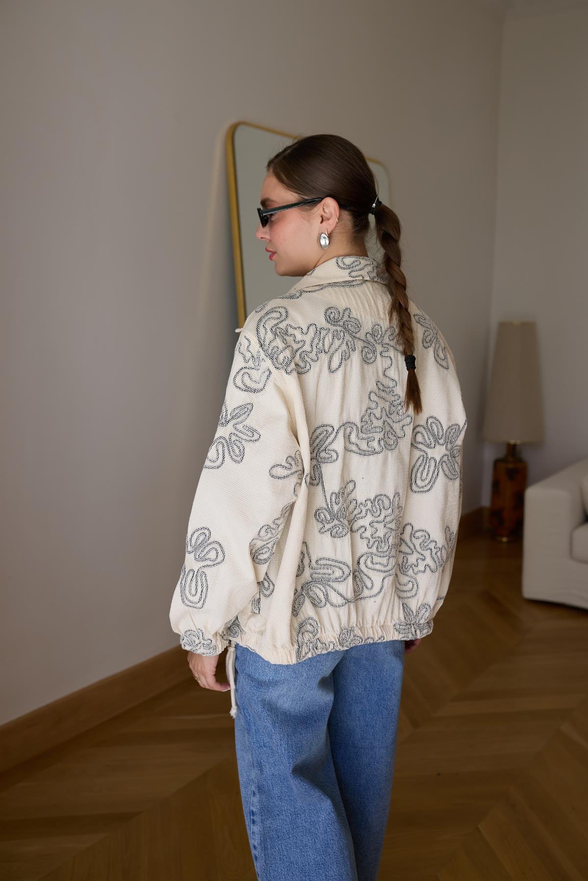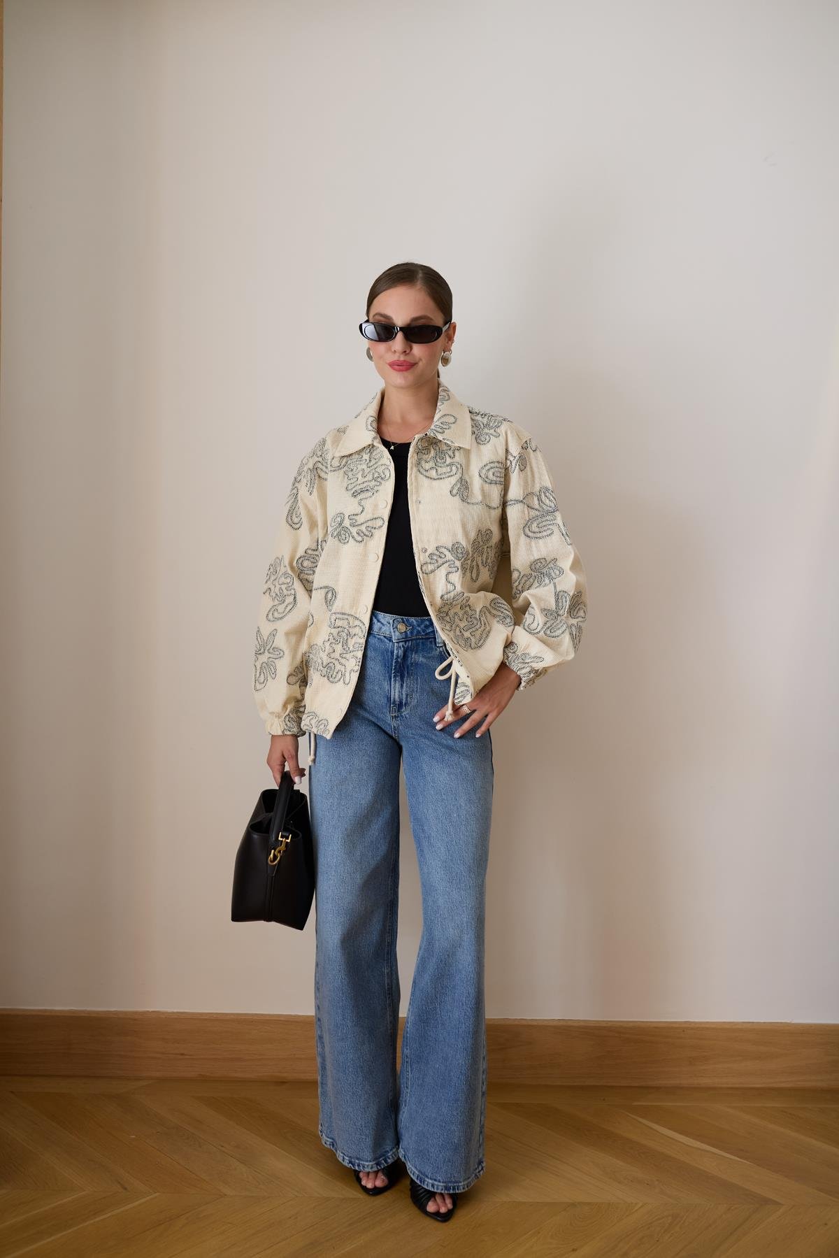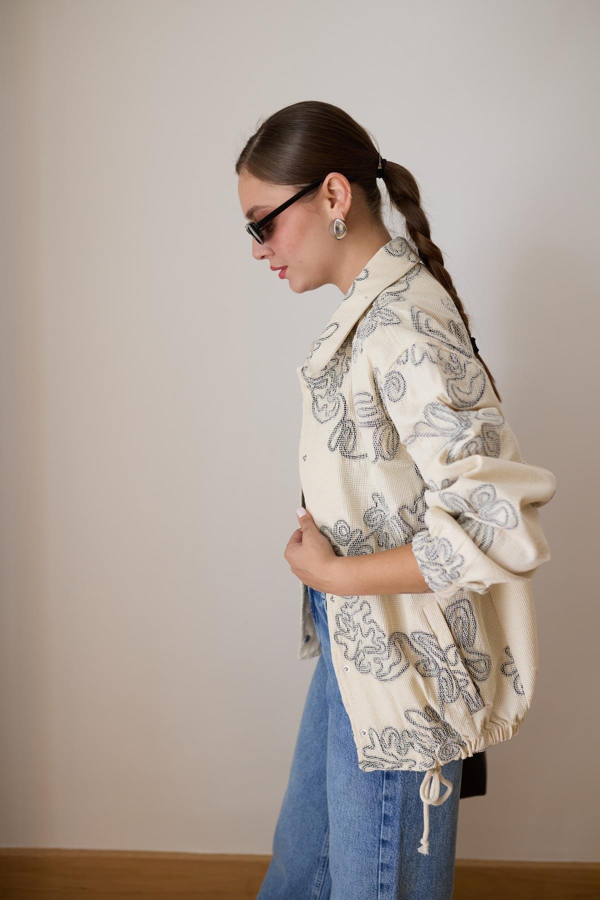 Taş File Nakış Detaylı Bilekleri Ve Beli Lastikli Bomber Ceket