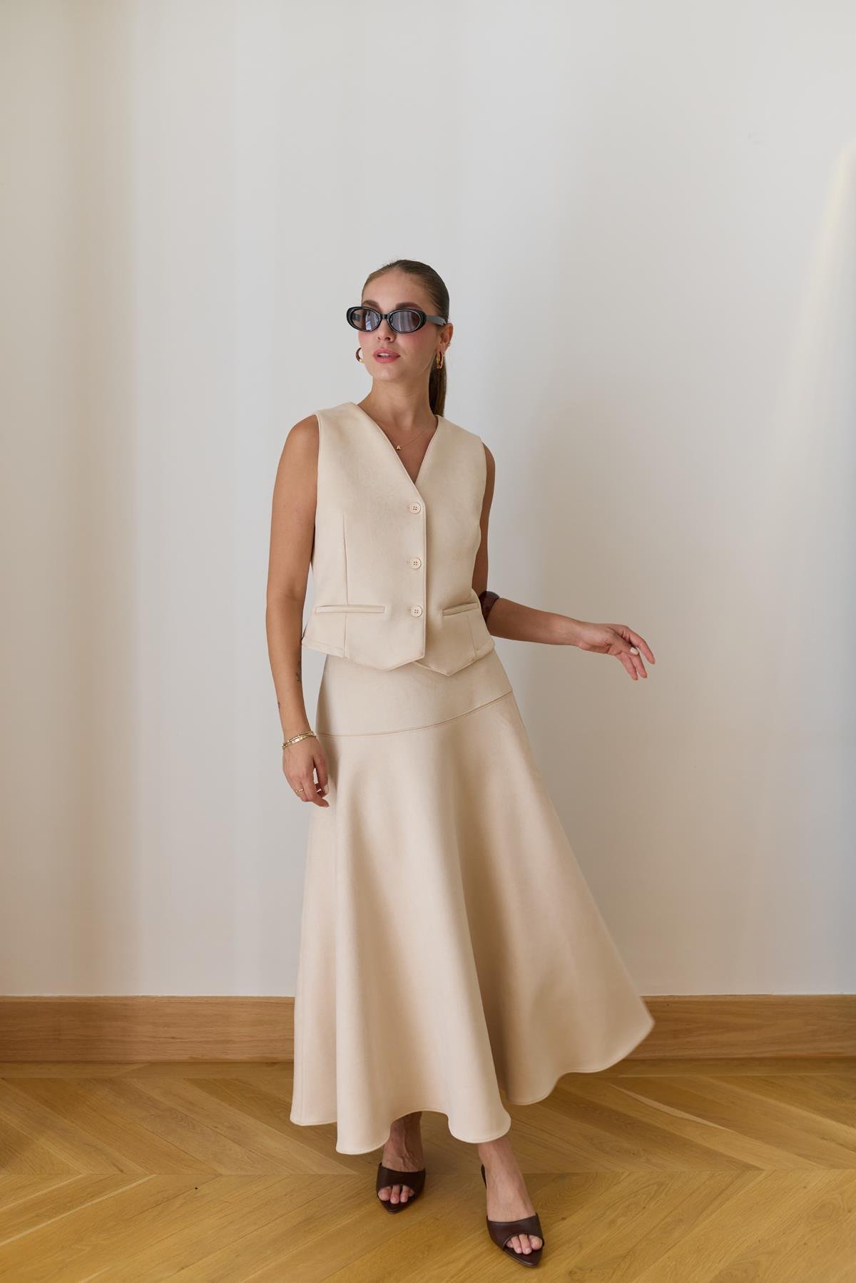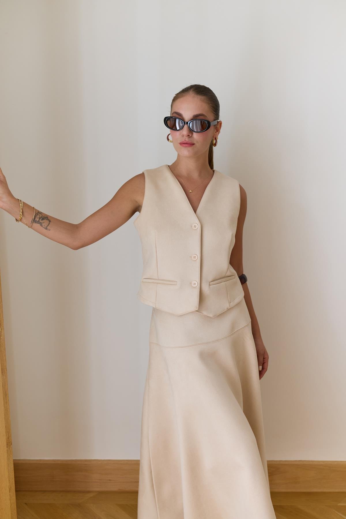 Taş Önden Süs Cepli Süet Yelek Ve Yandan Fermuarlı Etek Takım (122-00831)