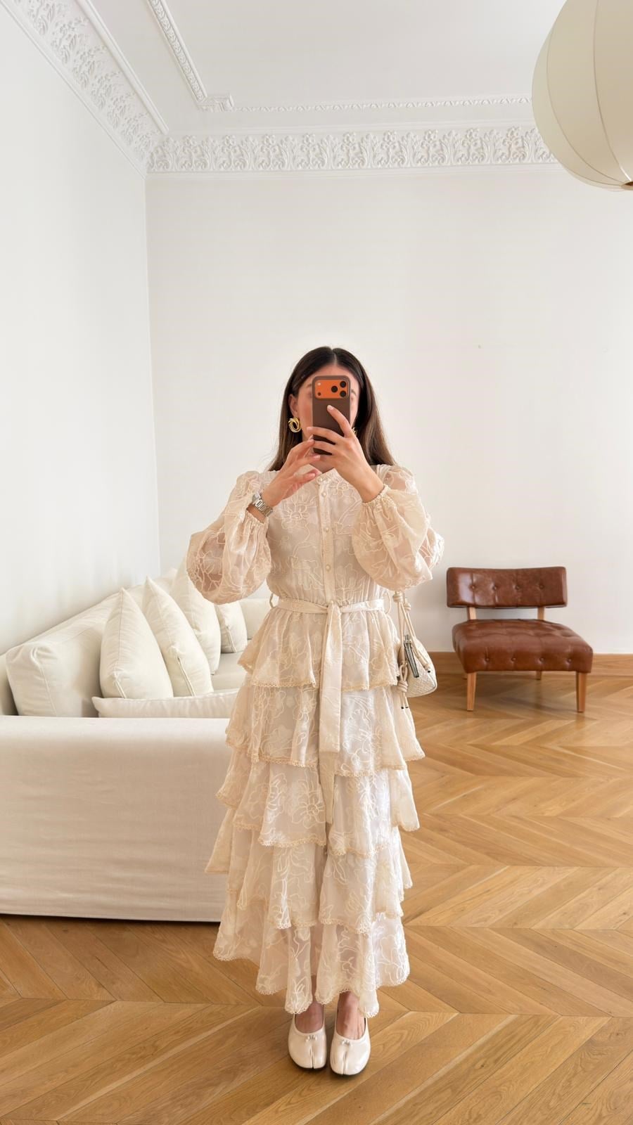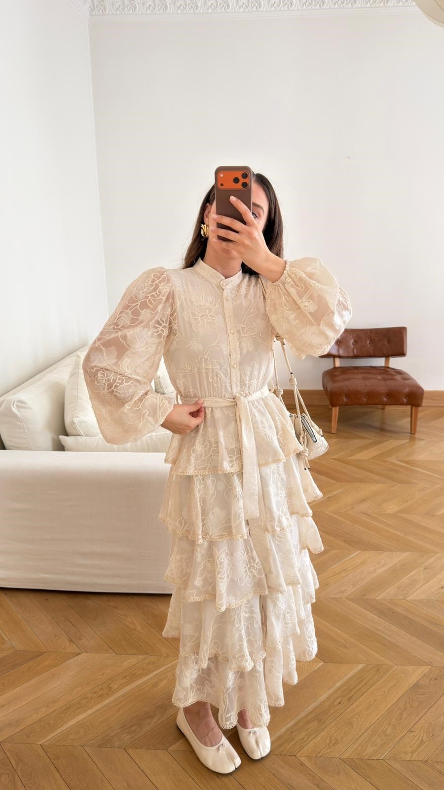 Taş Yarım Düğmeli Bilekleri Lastikli Kat Kat Nakışlı Elbise